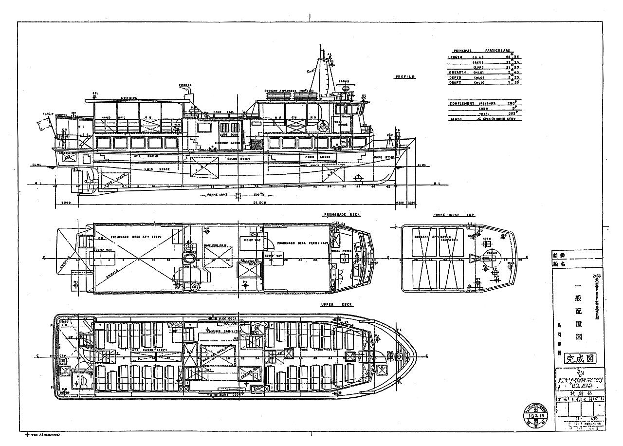 (Registered Size) Length: 22.03 m Beam: 5.4 m Draft: 2.28 m